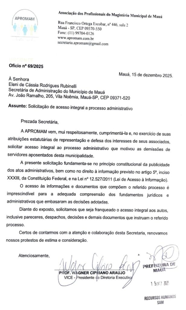 A APROMAM enviou um ofício à Secretária de Administração e Modernização, expressando a necessidade de acesso integral ao processo administrativo relacionado às recentes demissões de servidores aposentados na municipalidade.